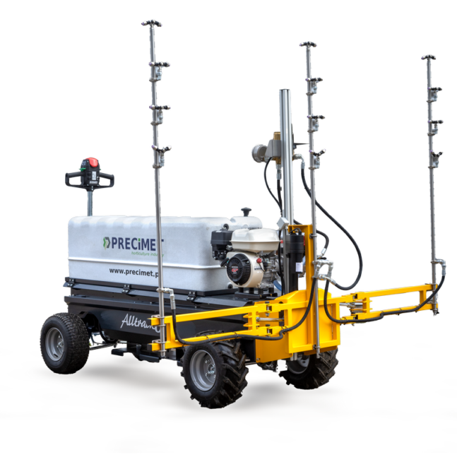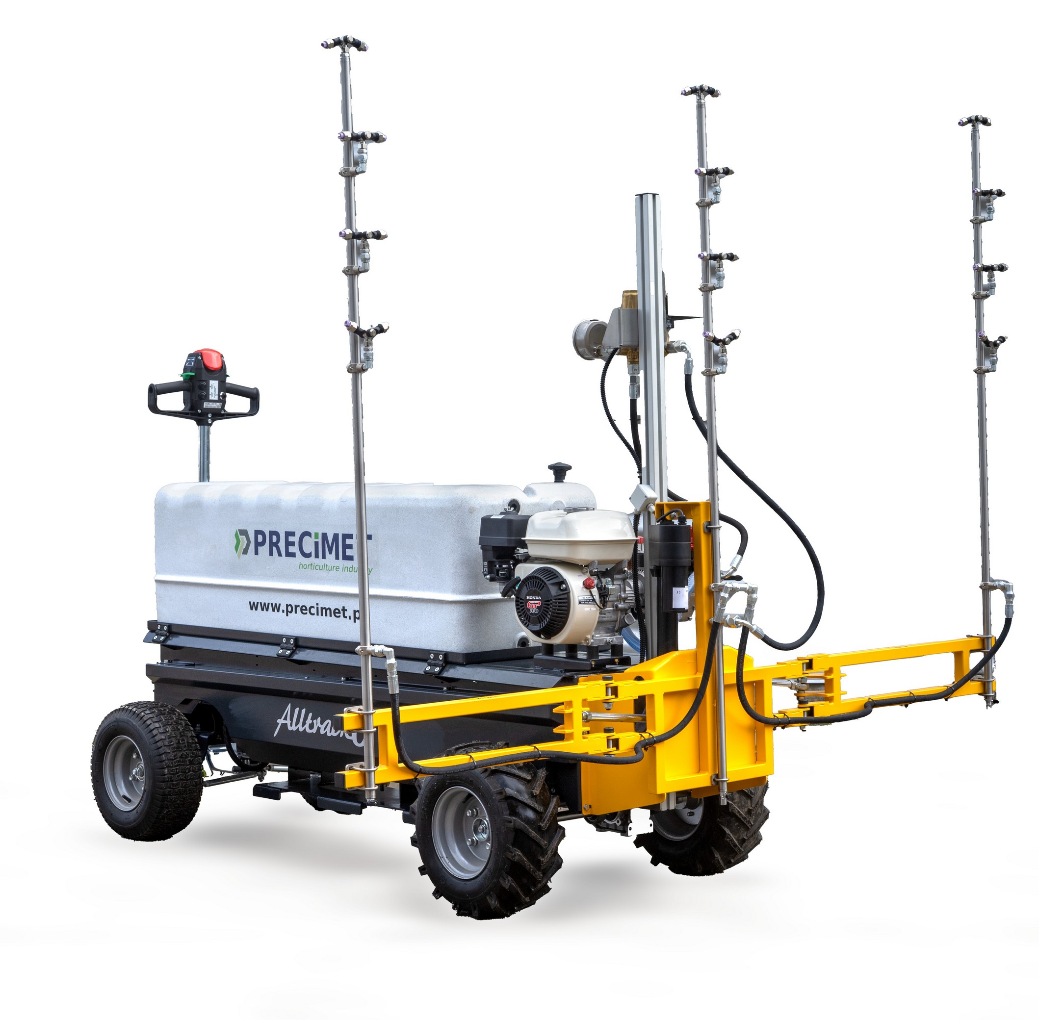 Mobile hand operated strawberry spraying trolley Alltrack-O2 with an electric drive, 300 l tank, gasoline pump unit (max pressure 25 bar, max output 25l/min) and with electrically driven spraying arms (folding / unfolding) for more efficient, effective and environmentally friendly work with crop protection treatments in your greenhouse or tunnel.